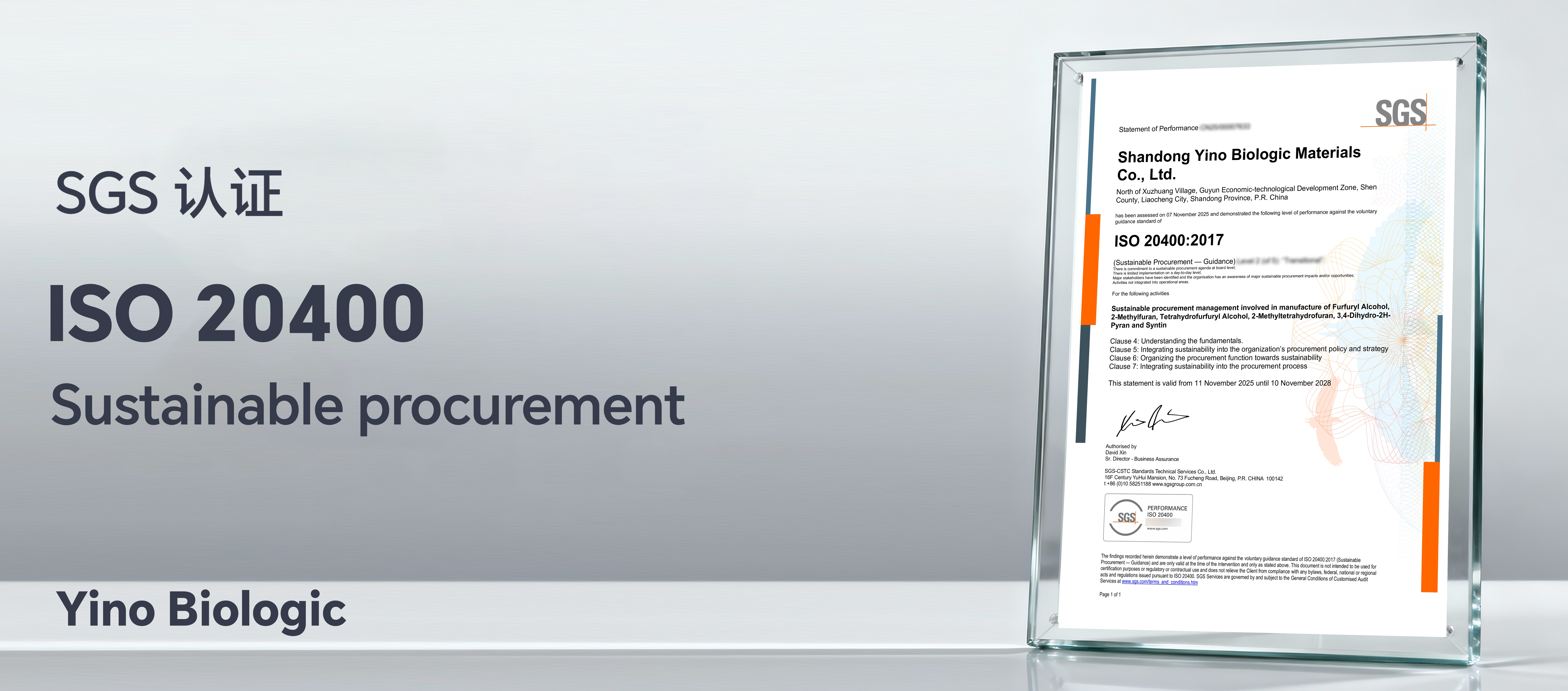 YINO Biologic Obtains the SGS ISO 20400 Sustainable Procurement Guidance Performance Assessment Statement