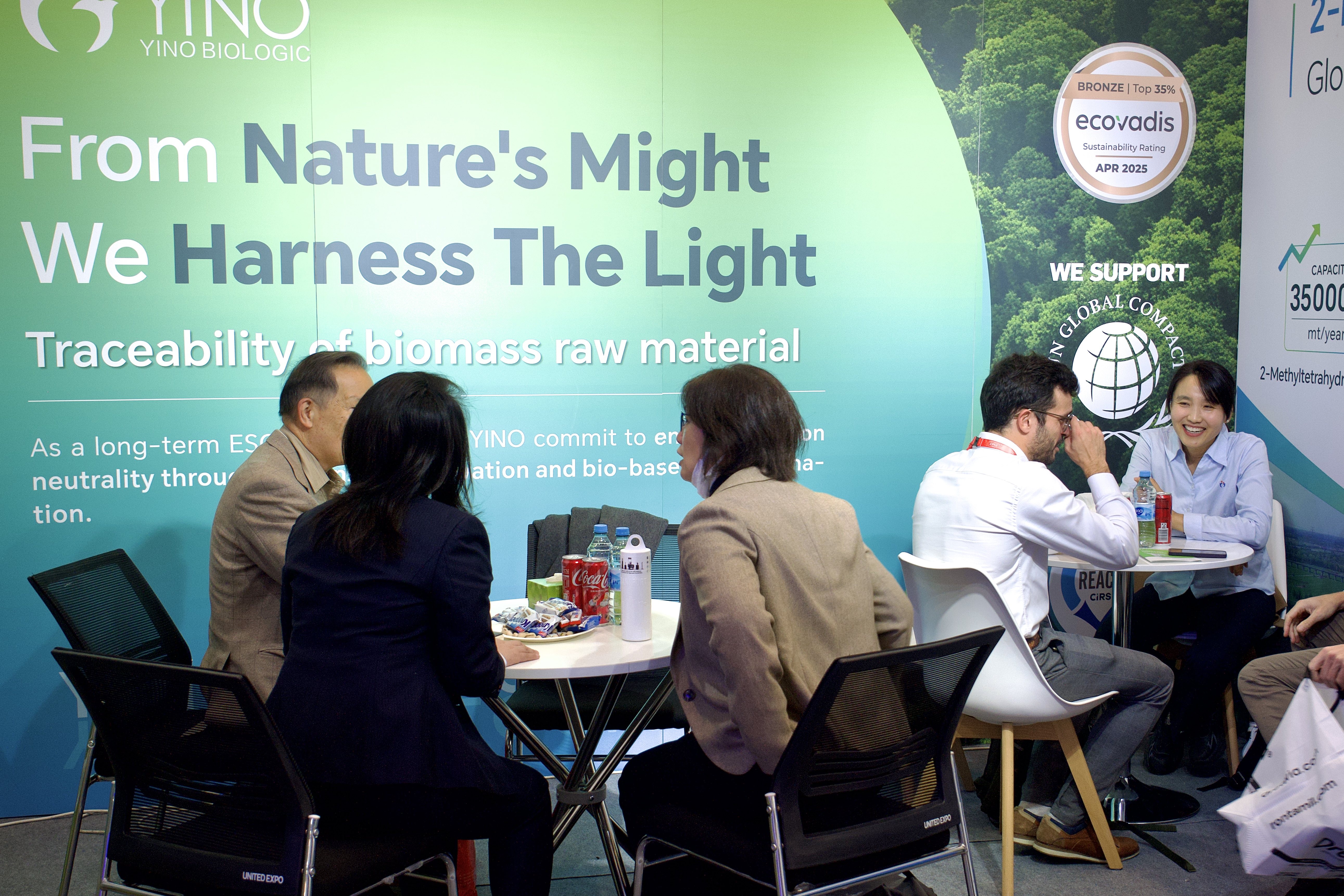 展會(huì)期間,YINO Biologic 展臺(tái)吸引了來(lái)自歐洲、印度、北美及亞洲的眾多制藥企業(yè)代表,成為現(xiàn)場(chǎng)關(guān)注的焦點(diǎn)。多家國(guó)際制藥公司與 API 供應(yīng)商對(duì)公司在綠色溶劑替代方案、碳減排路徑及合規(guī)標(biāo)準(zhǔn)等方面的實(shí)踐表示高度認(rèn)可,并就未來(lái)合作進(jìn)行了深入交流。多位合作伙伴認(rèn)為,YINO 的非糧生物基解決方案為制藥企業(yè)在可持續(xù)研發(fā)與生產(chǎn)優(yōu)化方面提供了切實(shí)可行的新路徑,助力全球客戶共同構(gòu)建低碳高效的綠色供應(yīng)鏈。